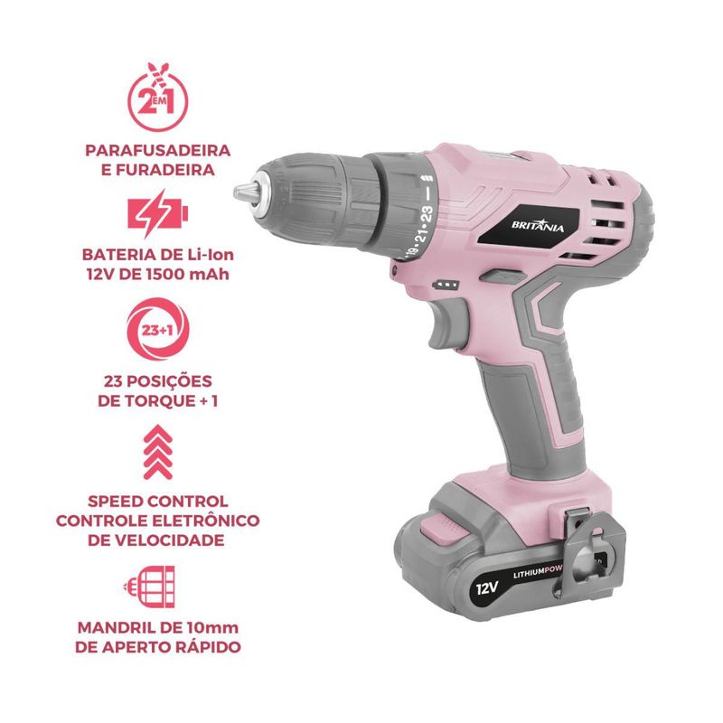 FerramentasParafusadeiraParafusadeira Rosa Britânia 15 acessórios 2 em 1 BPFE12R